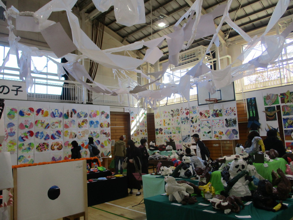 当日は、正門を入ったところから、1年生と4年生の協同作品がお出迎え、二小の体育館がすてきな美術館に変わりました。パステル画、水彩画、版画、木工作、焼き物、紙工作、粘土作品、映像作品…各学年が様々な表現に取り組み、それぞれの児童が、世界に一つだけの個性あふれるすてきな作品を展示しました。5.6年生は、家庭科作品も展示しました。