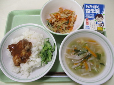 今日の献立 ※世界の料理「韓国」 ・コンナムルパプ ・ヤンニョムチキン ・トックスープ ・えだまめ ・牛乳 |