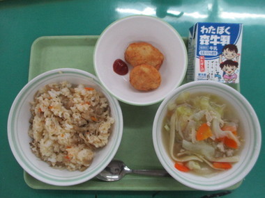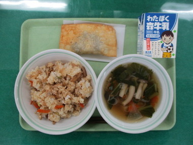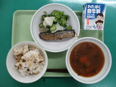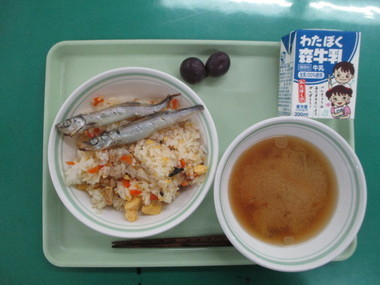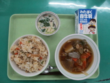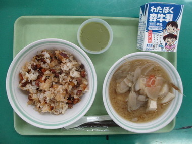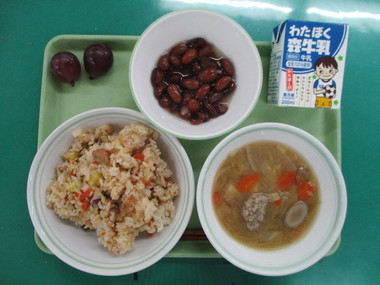 今日の献立 ・秋の香りごはん ・煮豆 ・いわしのつみれ汁 ・ぶどう ・牛乳 |