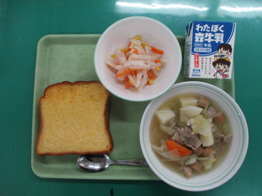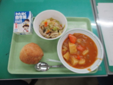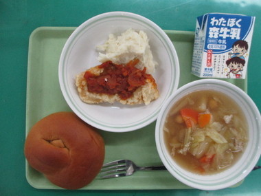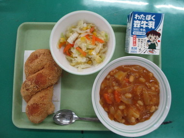 今日の献立 ※パンの日 ・焼きカレーパン ・野菜サラダ ・ポテトとベーコンのスープ ・牛乳 |