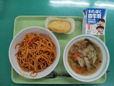 今日の献立 ・スパゲティナポリタン ・白菜とベーコンのスープ ・スイートポテト ・牛乳 |
