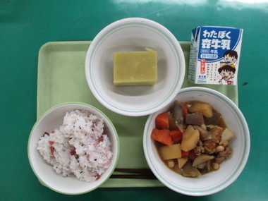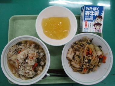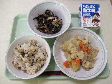 今日の献立 ・梅若ごはん ・いりどり ・ひとくち芋ようかん ・牛乳 |