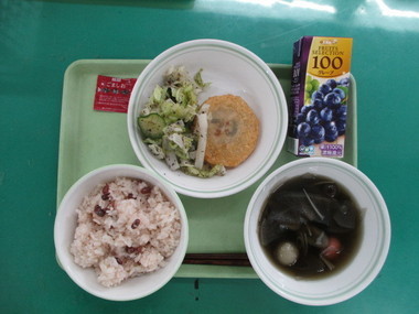 今日の献立〈市制70周年記念献立〉 ・お赤飯 ・70周年記念コロッケ ・白玉団子汁 ・ゆかり和え ・ぶどうジュース
