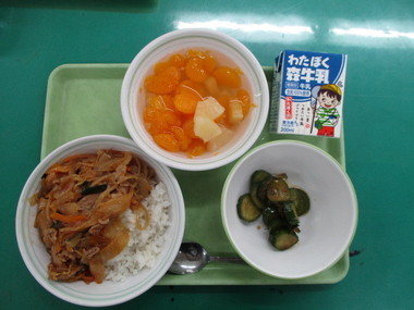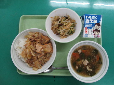 今日の献立 ・スタミナ丼 ・バンサンスー ・チンゲン菜とコーンの中華スープ ・牛乳 |