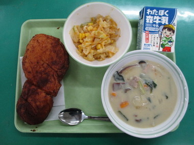 今日の献立 ・ジャッキーのかぼちゃパン ・コーンクリームシチュー ・枝豆サラダ ・牛乳 |