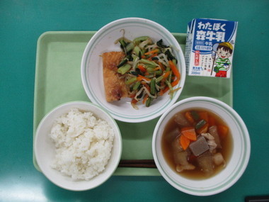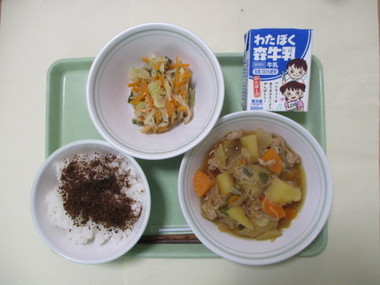 今日の献立 ・ごはん ・かつおでんぶ ・肉じゃが ・野菜のみそ和え ・牛乳 |