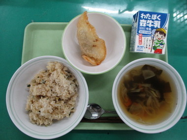 今日の献立 ・こぎつねごはん ・枝豆サラダ ・豆腐とわかめのみそ汁 ・牛乳 |