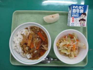 今日の献立 ・おそば屋さんのカレー丼 ・野菜サラダ ・梨 ・牛乳 |