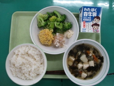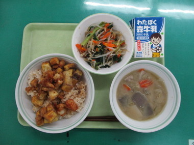 今日の献立 ※食育月間 牛乳の日 ・麻婆豆腐丼 ・わかめと豆腐中華スープ ・杏仁豆腐 ・牛乳 |