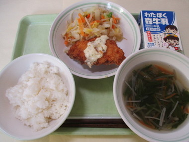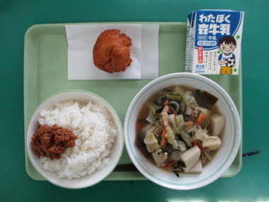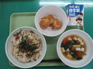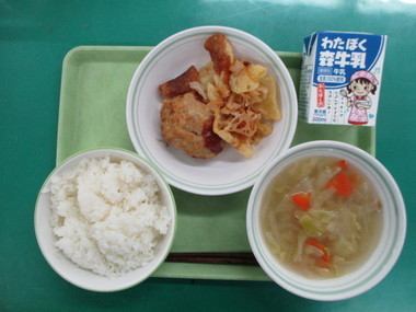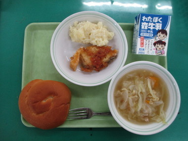 今日の献立 ・ごはん ・かつおの竜田揚げ ・キャベツと昆布のさっぱり和え ・豆腐と油揚げのみそ汁 ・牛乳 |
