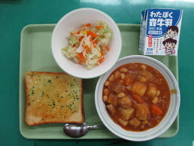 今日の献立 ・ガーリックトースト ・チリビーンズシチュー ・フレンチサラダ ・牛乳 |