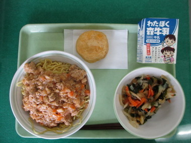 今日の献立 ・ソース焼きそば ・じゃがいものみそ和え ・大根と豆腐の中華スープ ・牛乳 |