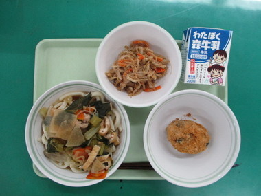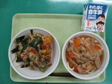 今日の献立 ・ちゃんこうどん ・ちくわの2色揚げ ・和風サラダ ・牛乳 |