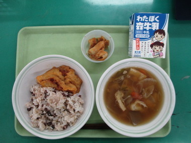 今日の献立 ※歯と口の健康週間 ・ごはん ・から揚げと玉ねぎの豆乳うま煮 ・大豆と小魚のカリカリ揚げ ・牛乳 |