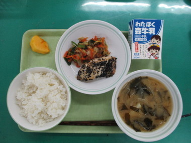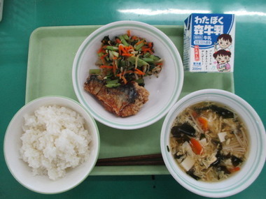 今日の献立 ・ごはん ・さばのごま揚げ ・野菜の磯辺和え ・かきたま汁 ・牛乳 |