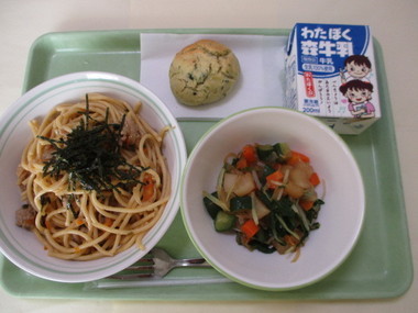 今日の献立 ・和風スパゲッティ ・野菜のコロコロサラダ ・小松菜のしっとりスコーン ・牛乳 |