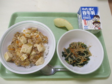 今日の献立 ・麻婆豆腐丼 ・ニラのさっぱりナムル ・りんご ・牛乳 |