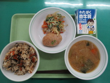 今日の献立 ・ひじきごはん ・枝豆入りつくね ・野菜の生姜和え ・なめこのみそ汁 ・牛乳 |