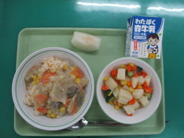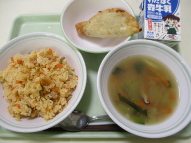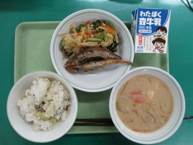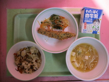 今日の献立 ・さつまいもごはん ・ししゃものカレー揚げ ・野菜の千草あえ ・豆乳の味噌汁 ・牛乳 |