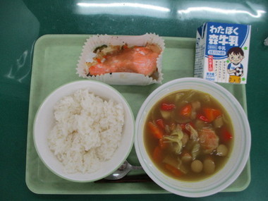 今日の献立 ・ごはん ・スープカレー ・鮭のチャンチャン焼き ・牛乳 |