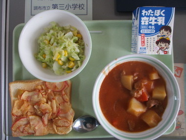 今日の献立 ・アップルトースト ・ハンガリアシチュー ・イタリアンドレッシングサラダ ・牛乳 |