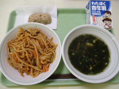 今日の献立 ・沖縄焼きそば ・沖縄アーサー汁 ・ちんすこう ・牛乳 |