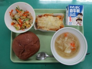 今日の献立 ・チョコチップパン ・ラザニア ・白菜のガーリックサラダ ・野菜スープ ・牛乳 |