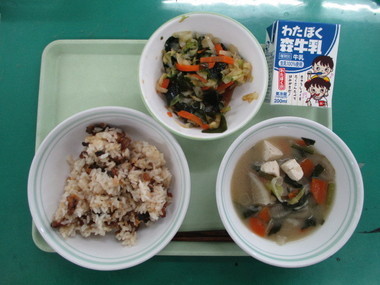 今日の献立 ※開校記念日 ・お赤飯 ・鶏の三小照り焼き ・キャベツと昆布のさっぱり和え ・すまし汁 ・牛乳 |