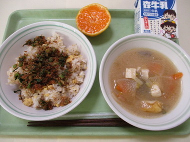 今日の献立 ・三色そぼろ丼 ・豚汁 ・菊花みかん ・牛乳 |
