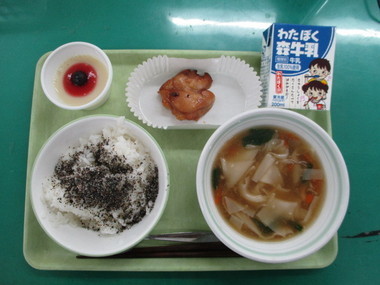 今日の献立 ・ごはん ・砂かけばばあの砂ふりかけ ・大山どりの照り焼き ・一反もめんのひらひらスープ ・目玉のおやじゼリー ・牛乳 |