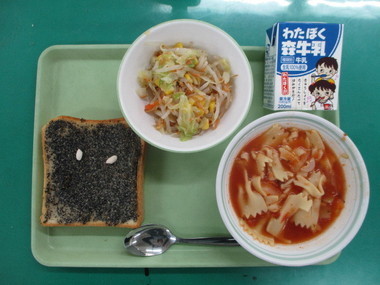 今日の献立 ・スパゲッティナポリタン ・ハニーサラダ ・オニオンスープ ・牛乳 |