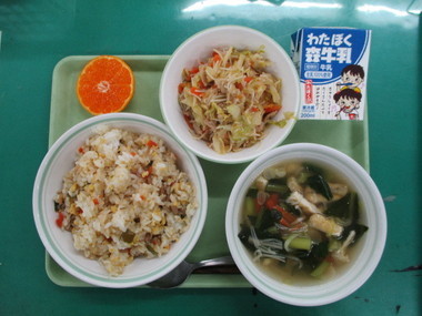 今日の献立 ・やきめし ・焼きビーフン ・とり肉のすまし汁 ・菊花みかん ・牛乳 |
