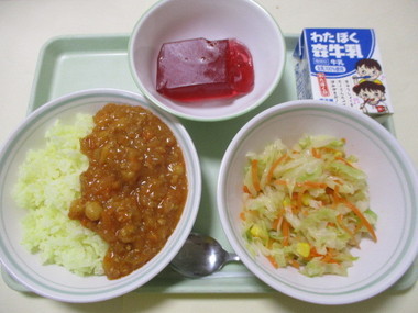 今日の献立 ・ひよこ豆のカレーライス ・コールスローサラダ ・ぶどうゼリー ・牛乳 |