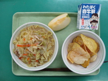 今日の献立 ・豚こつラーメン ・野菜チップ ・木島平村のりんご ・牛乳 |
