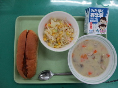 今日の献立 ・スラッピー・ジョー ・クラムチャウダー ・コーン入りサラダ ・牛乳 |