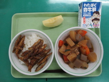 今日の献立 ・ごはん ・鶏肉と大根の煮物 ・わかさぎ佃煮風 ・りんご ・牛乳 |