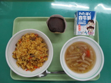 今日の献立 ・カレーピラフ ・白菜とベーコンのスープ ・バナナココアマフィン ・牛乳 |