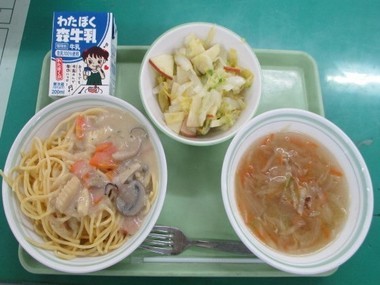 今日の献立 ・スパゲティークリームソース ・ジュリエンヌスープ ・りんごと白菜のサラダ ・牛乳 |