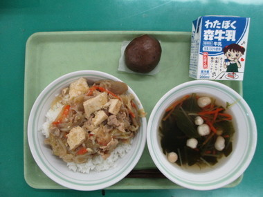 今日の献立 ・みそすき丼 ・すまし汁 ・ほうじ茶まんじゅう ・牛乳 |