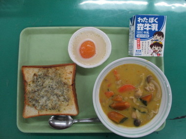 今日の献立 ・じゃこトースト ・パンプキンシチュー ・おかしな目玉焼き ・牛乳 |