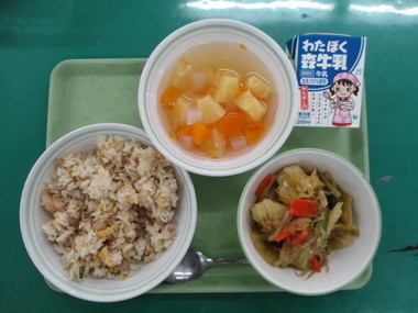 今日の献立 ※梅の日 ・キムチチャーハン ・チンゲン菜のスープ ・梅ゼリー ・牛乳 |