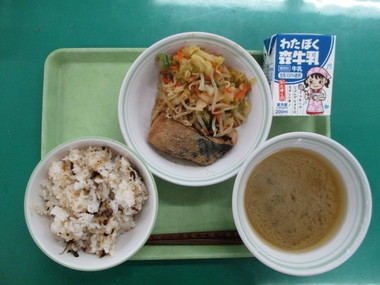 今日の献立 ・塩昆布ごはん ・鯖のぬか炊き ・野菜の生姜和え ・根菜の味噌汁 ・牛乳 |