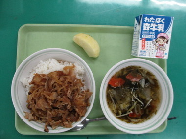 今日の献立 ・豚スキ丼 ・あおさ汁 ・りんご ・牛乳 |