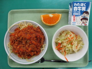 今日の献立 ・こまったさんのスパゲティ ・コールスローサラダ ・清見オレンジ ・牛乳 |