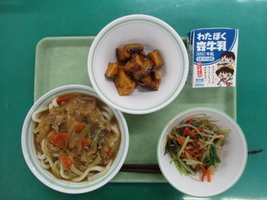 今日の献立 ・カレーうどん ・キャラメルポテト ・玉ねぎドレッシングサラダ ・牛乳 |