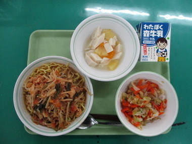 今日の献立 ・トマト担々麺 ・こんにゃくサラダ ・杏仁豆腐 ・牛乳 |
