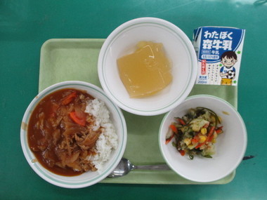 今日の献立 ・夏野菜カレー ・野菜のさっぱりジュレサラダ ・冷凍みかん ・牛乳 |