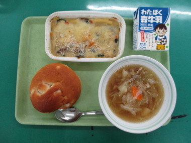 今日の献立 ・パインパン ・マカロニグラタン ・白いんげん豆の田舎風スープ ・牛乳 |