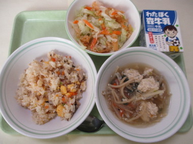 今日の献立 ・チャーハン ・肉団子と春雨のスープ ・パリパリサラダ ・牛乳 |