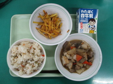今日の献立 ・舞茸ごはん ・秋野菜の煮物 ・芋けんぴ ・牛乳 |